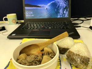 長崎に行く前に終わらせたい仕事がいくつかあるので、今日はデスクでお昼ごはん🍙 Sam作の肉じゃが! ryoko