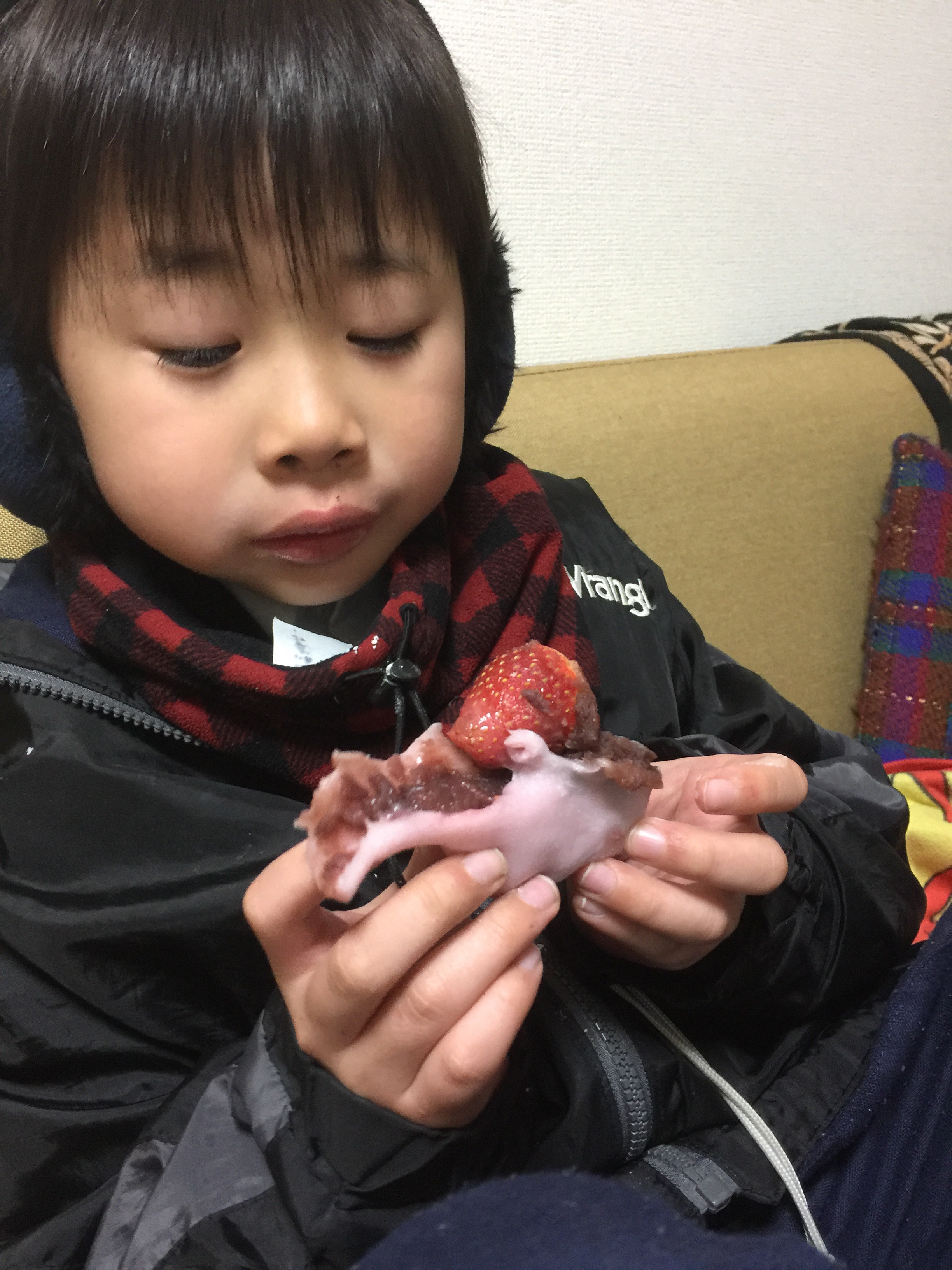 自分で買ったのに、中からイチゴが出て来たことに驚いて、イチゴだけ最後に食べようと苦心しているみたいですね〜。イチゴ狩りに行きたいなぁ!春は、毎年群馬の赤城山の方に行って、大きなイチゴをたくさん食べてましたが、ハウスの中で飼っている蜂を見た途端イチゴ狩りが好きでなくなってしまった優斗です。「蜂がこの美味しいイチゴの為に働いてくれてるんだよ」と言っても、そんな事は関係ない!タダタダ、蜂が怖いのです。