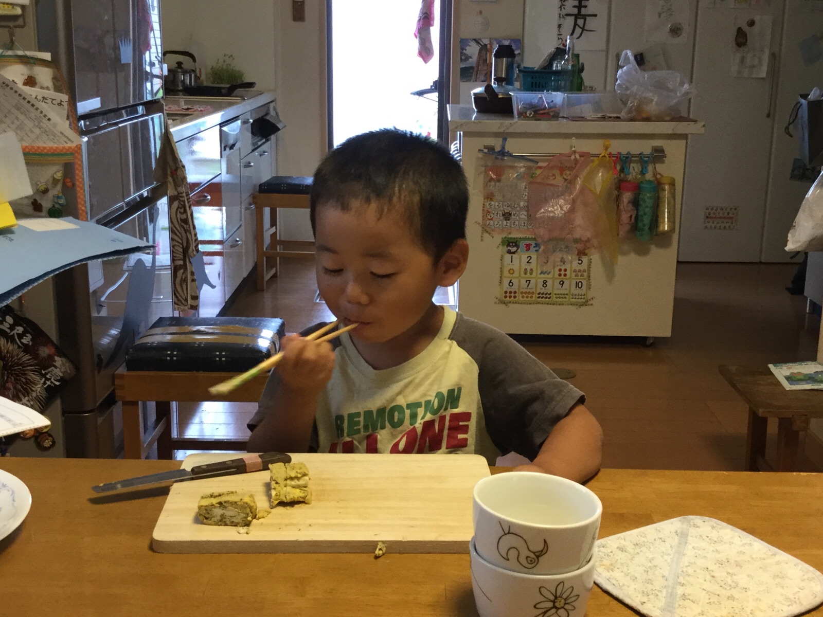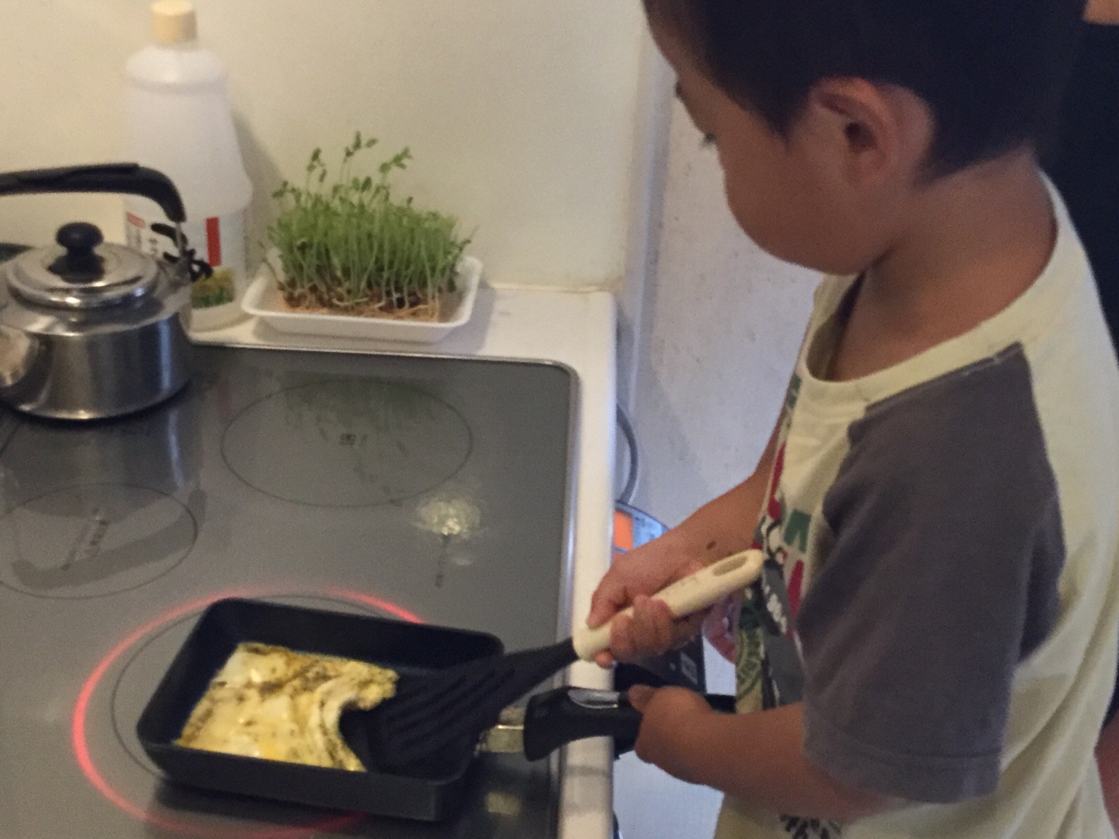 はるくん、自分で卵焼きを焼いています。ちなみにお母さんは今日は健康診断で何も食べられません。masukawa