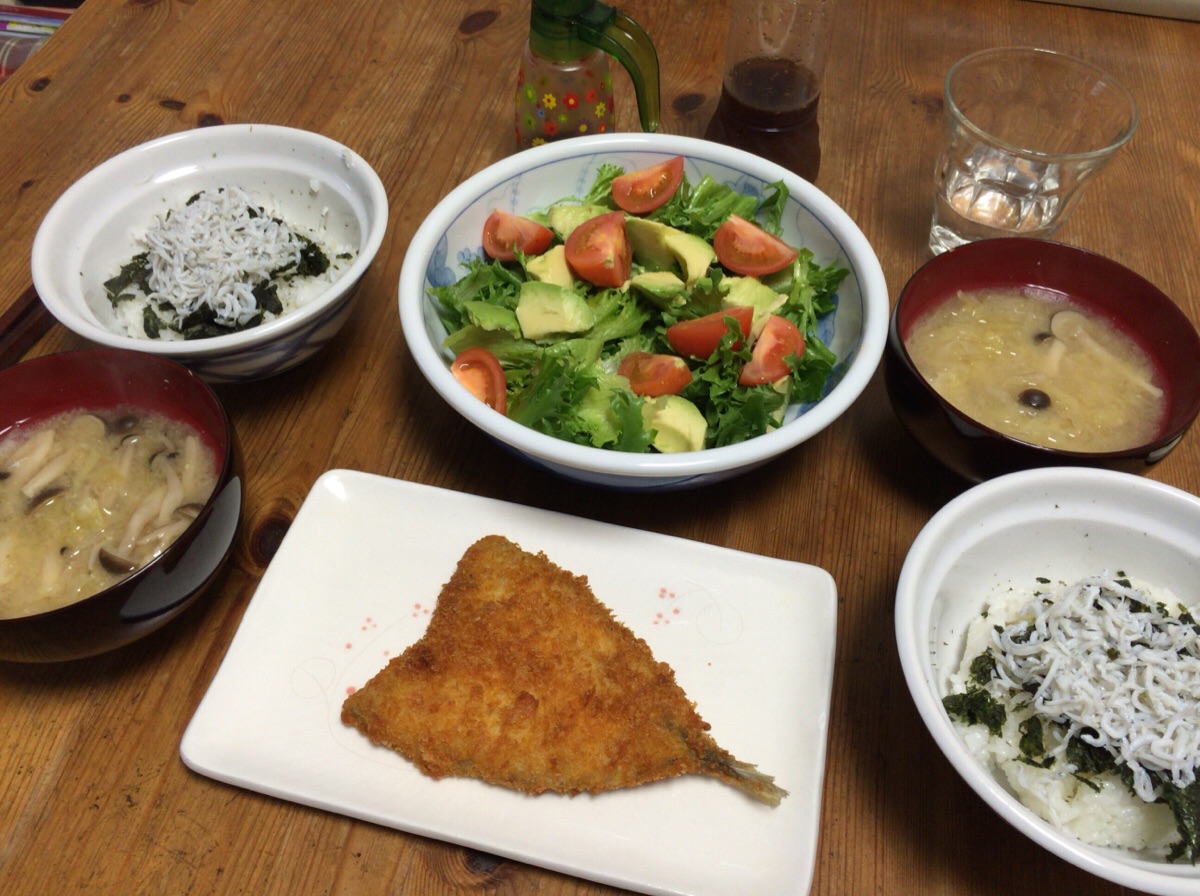 いやしの集いは終わりました。これから帰ります。写真は、今夜の夕ごはんではなく、今朝の朝ごはんです。生しらす丼とキャベツの味噌汁。鯵フライは昨夜の残りです。最近、唯の希望で和食にしています。 オギハラ
