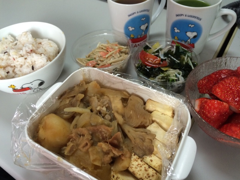 美味しいジャガイモをいただいたので…肉じゃがに…♪昨日のデパ地下で買ったお惣菜の残りも… ! amagai