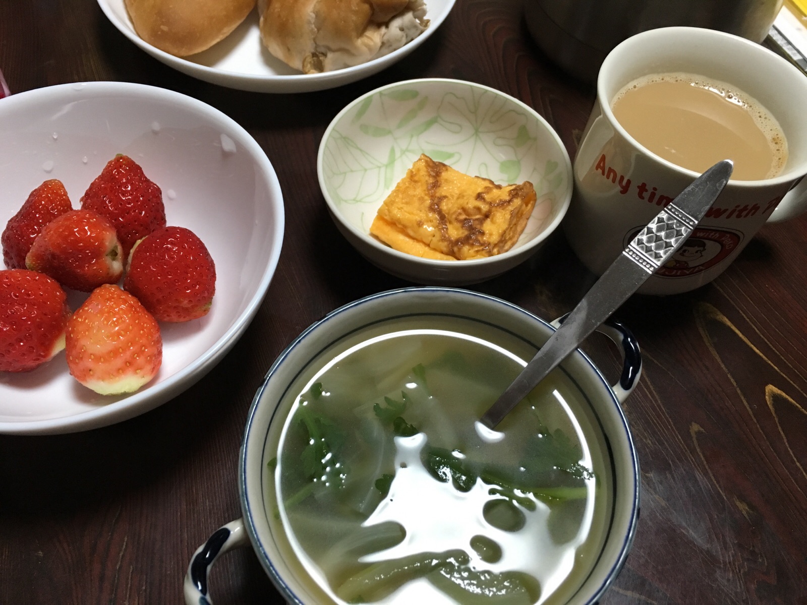 朝食を母と食べてます。 パンとスープと昨日の残り物。 Kayano