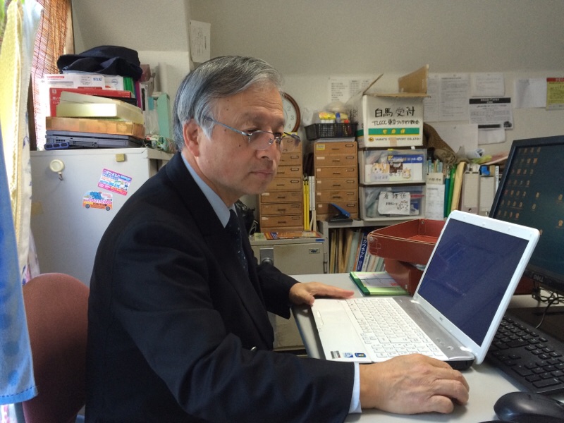 一度、3階会堂に…。礼拝前のわずかな時間ですが作業中! amagai