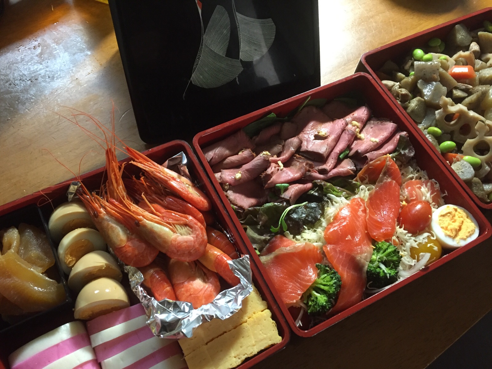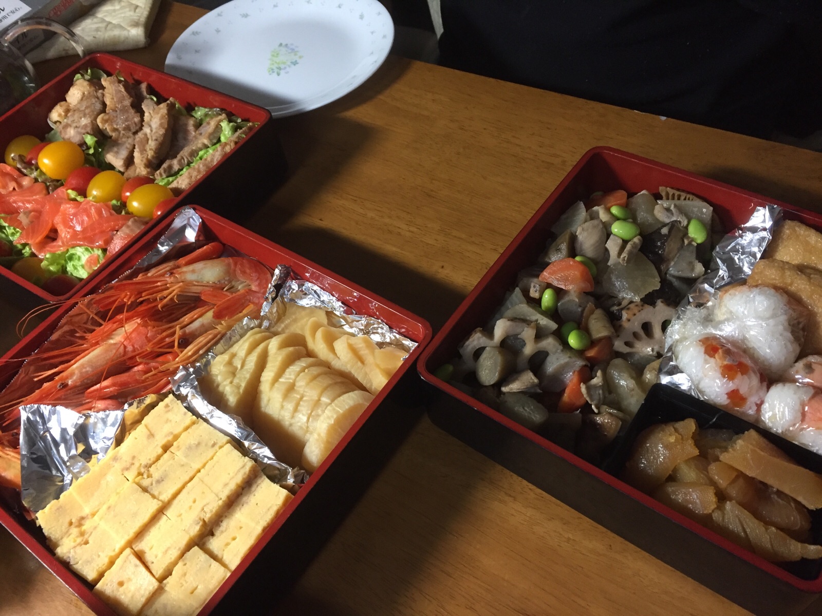 とりあえずお重に詰める。 →なんとなくお節。 でも今日はデニシさんの見て、無性にカップそばが食べたい! Joy.m
