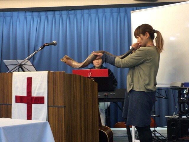 角笛が吹かれました。 火曜礼拝スタート。 Kayano
