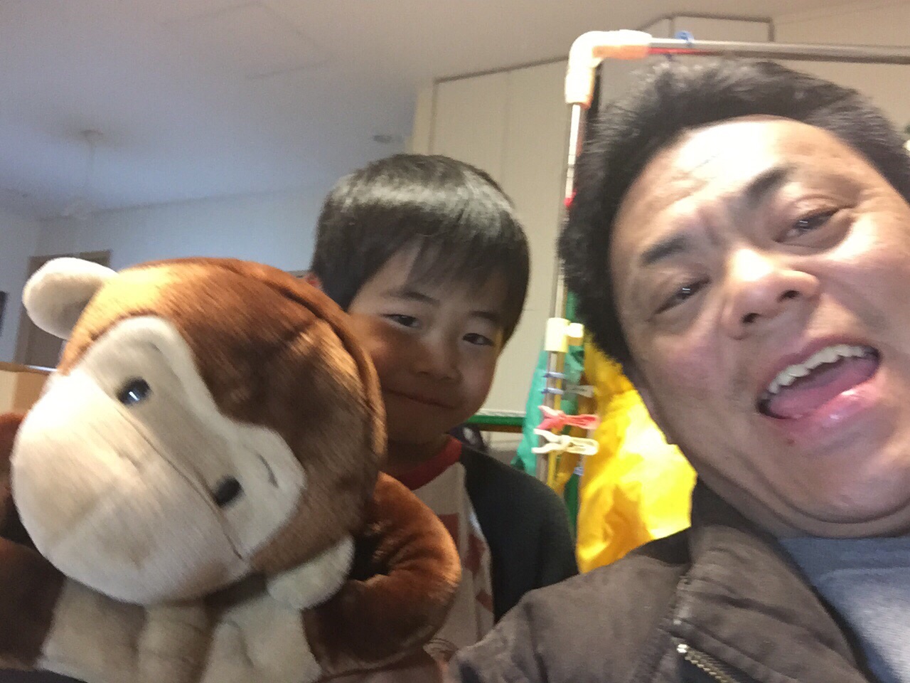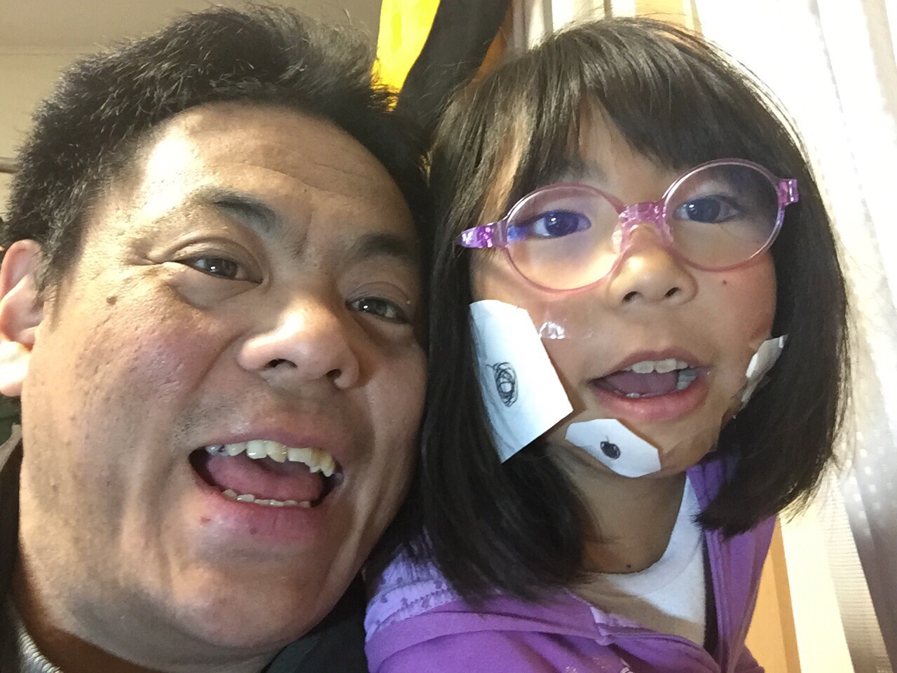 顔に手作りお面を貼っています。