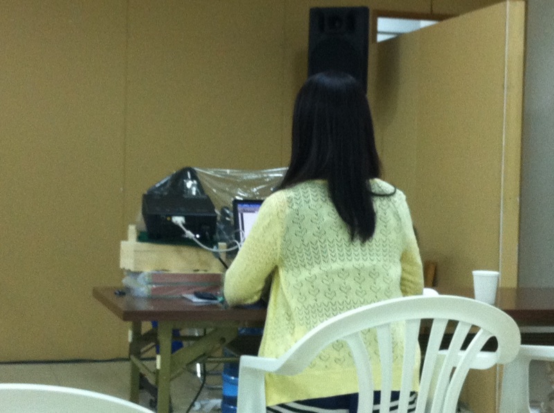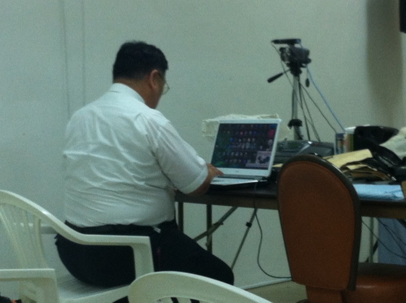 新しい歌集から、礼拝で使う曲を選んでおられます。 オーケストラやコーラスの人達が一斉に準備に入ることでしょう! 沖縄