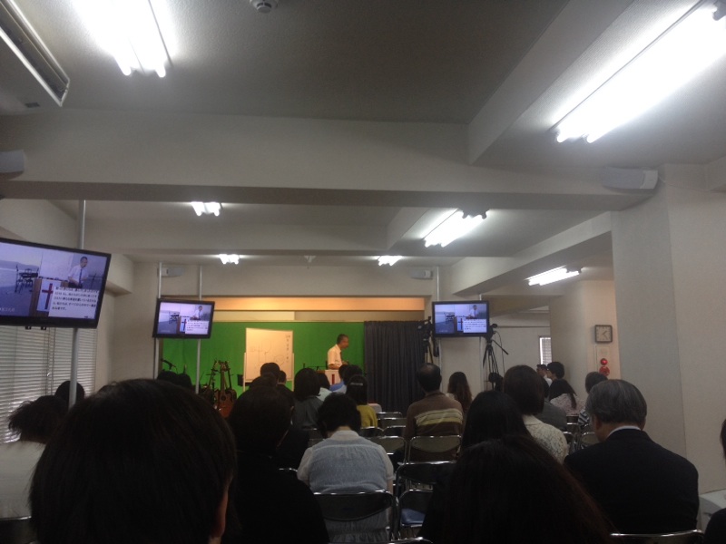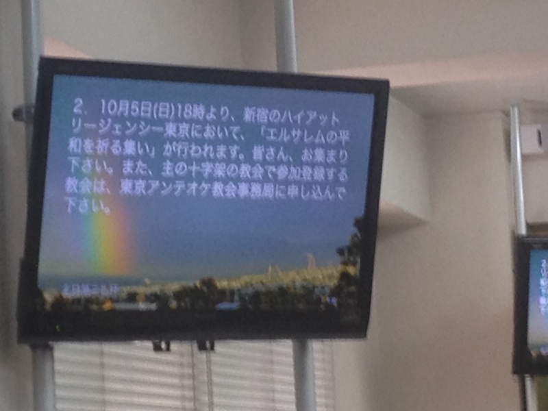 モニターにお知らせが映されています。 写真はエルサレムの平和のために祈る集いについて。