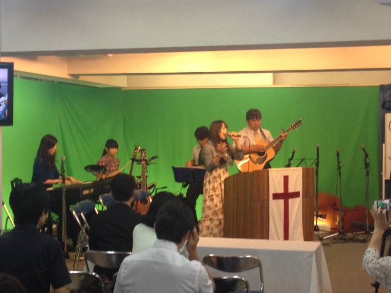 先ほどお祈りしてスタンバイしていたグループと共にステージで賛美しています。