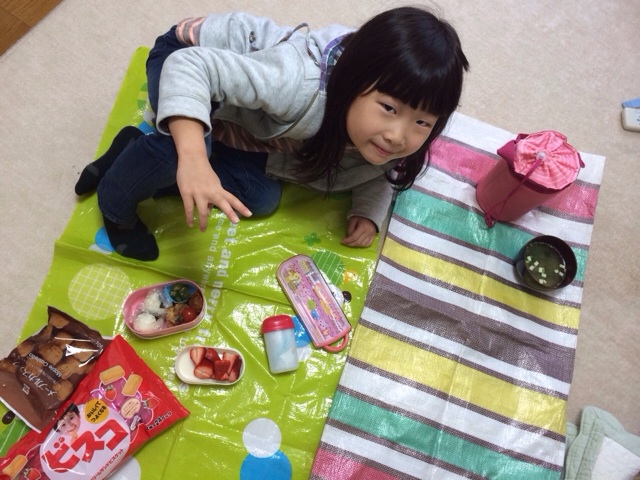 今日は幼稚園のお別れ遠足でしたが、インフルエンザで行けませんでした…。 少しでも遠足気分を、とお弁当を作り、部屋でシートをひいて食べます。 もちろん、オヤツもあります! ふじい