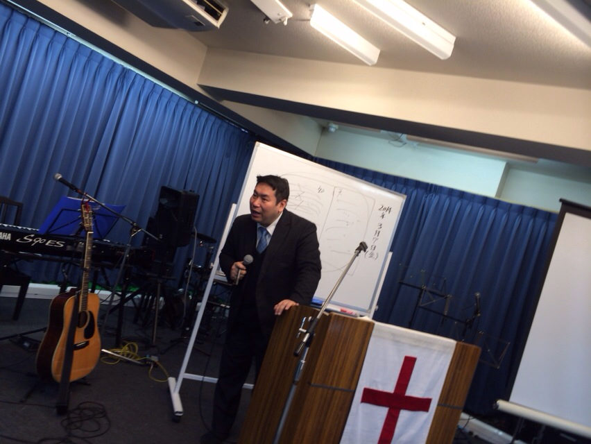 メッセージ中の真境名牧師。 熱が入ってます! 風邪の熱の方は下がったんでしょうか? 東京アンテオケ教会会堂にて