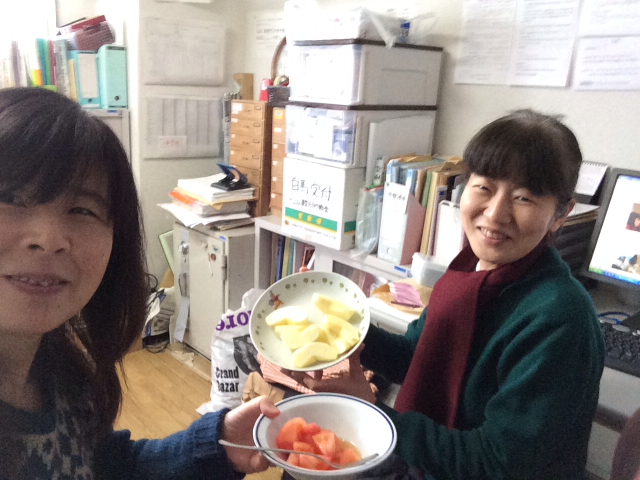 加藤牧師とお昼を食べます。 カレーにトマトとりんご。 教会事務所にて