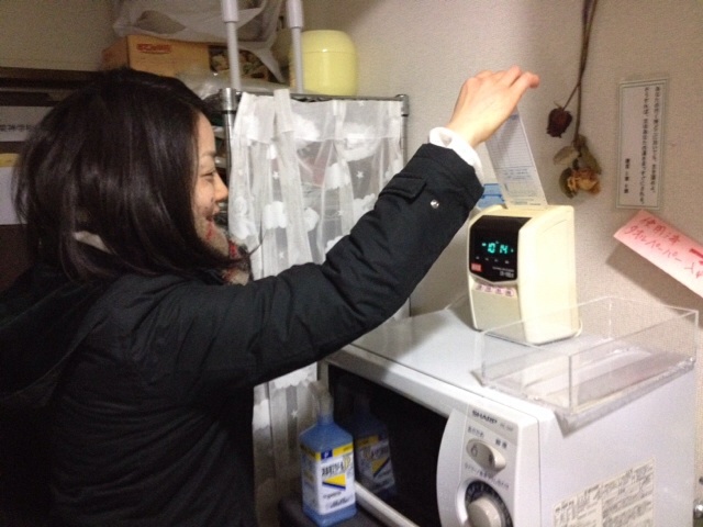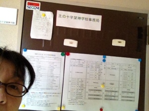 山中さんも出勤です。 タイムカード押してと。 神学校スタッフ JOY