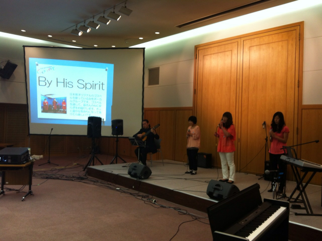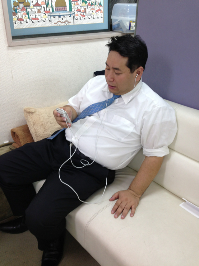 真境名牧師がヨハネくんと明日の企画について、iPhoneで打ち合わせをしています。写真を撮ったら邪魔したみたいで、外に行っちゃました。ごめんなさい。
