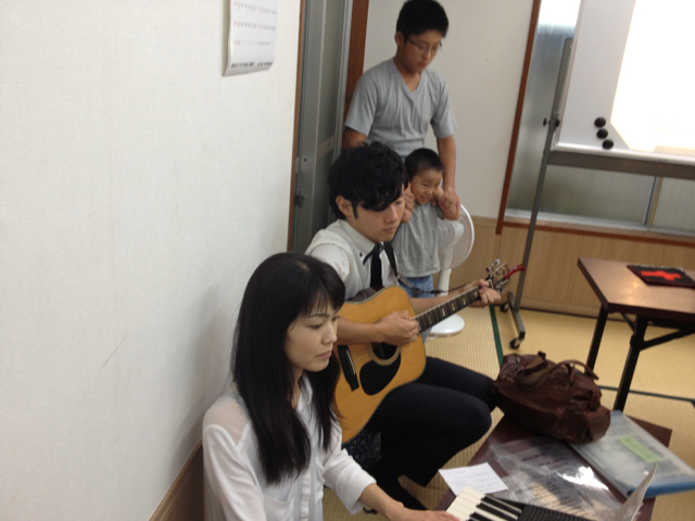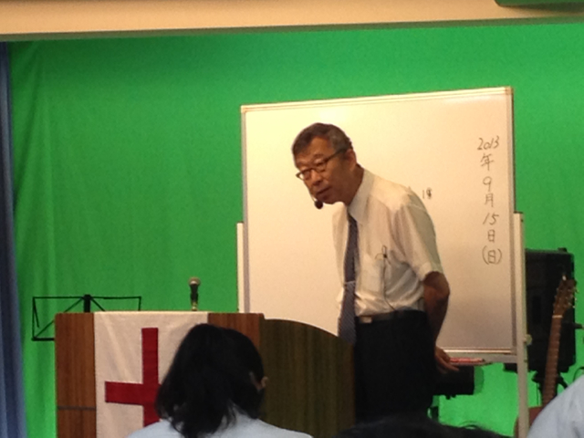 礼拝前。プランナー真境名牧師、新しい賛美の準備をされています!