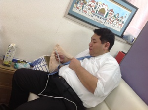 いつもの場所でくつろぎ中の真境名牧師! そしていつもの唐揚げ弁当食べて、ご満悦!