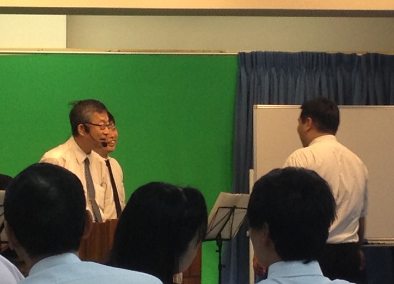 昨日の「プランナー選考企画」を終えて、第七礼拝前の一コマです。 後ろ姿で表情は見えませんが…背中から安堵感が…(^^) ピーター真境名牧師☆♪