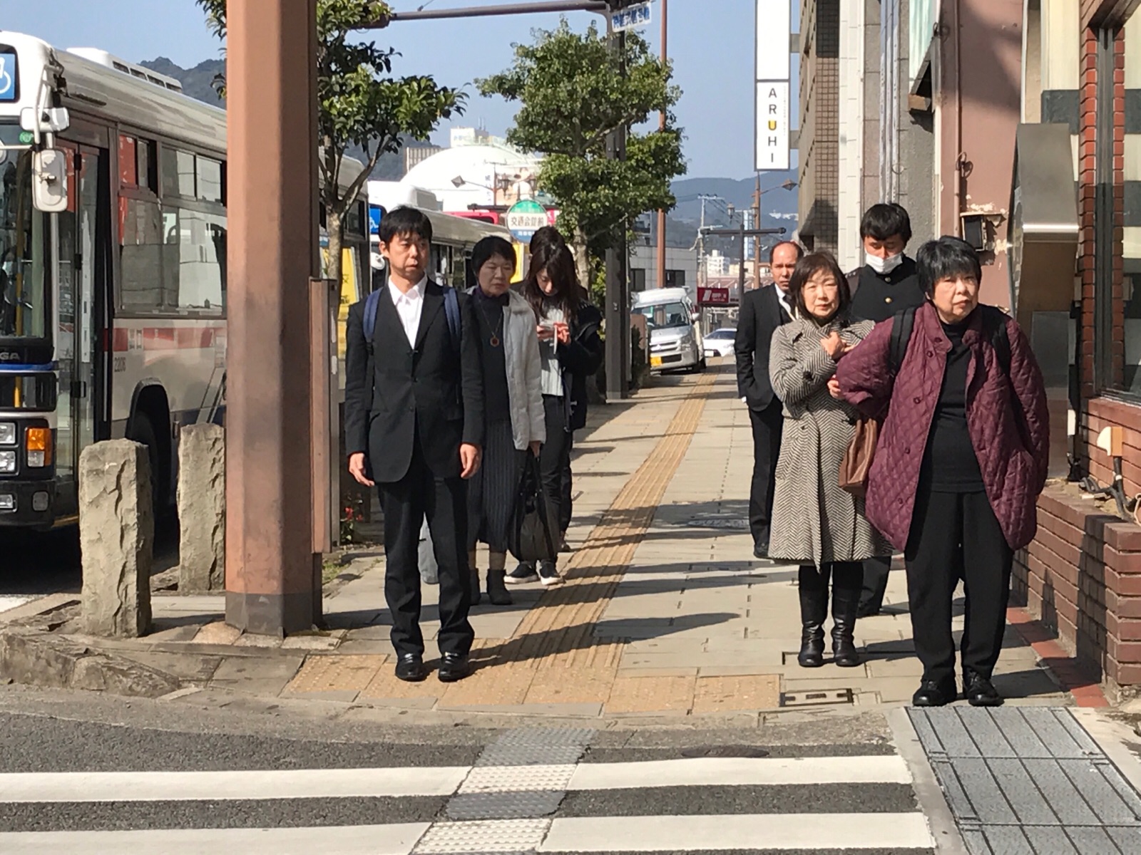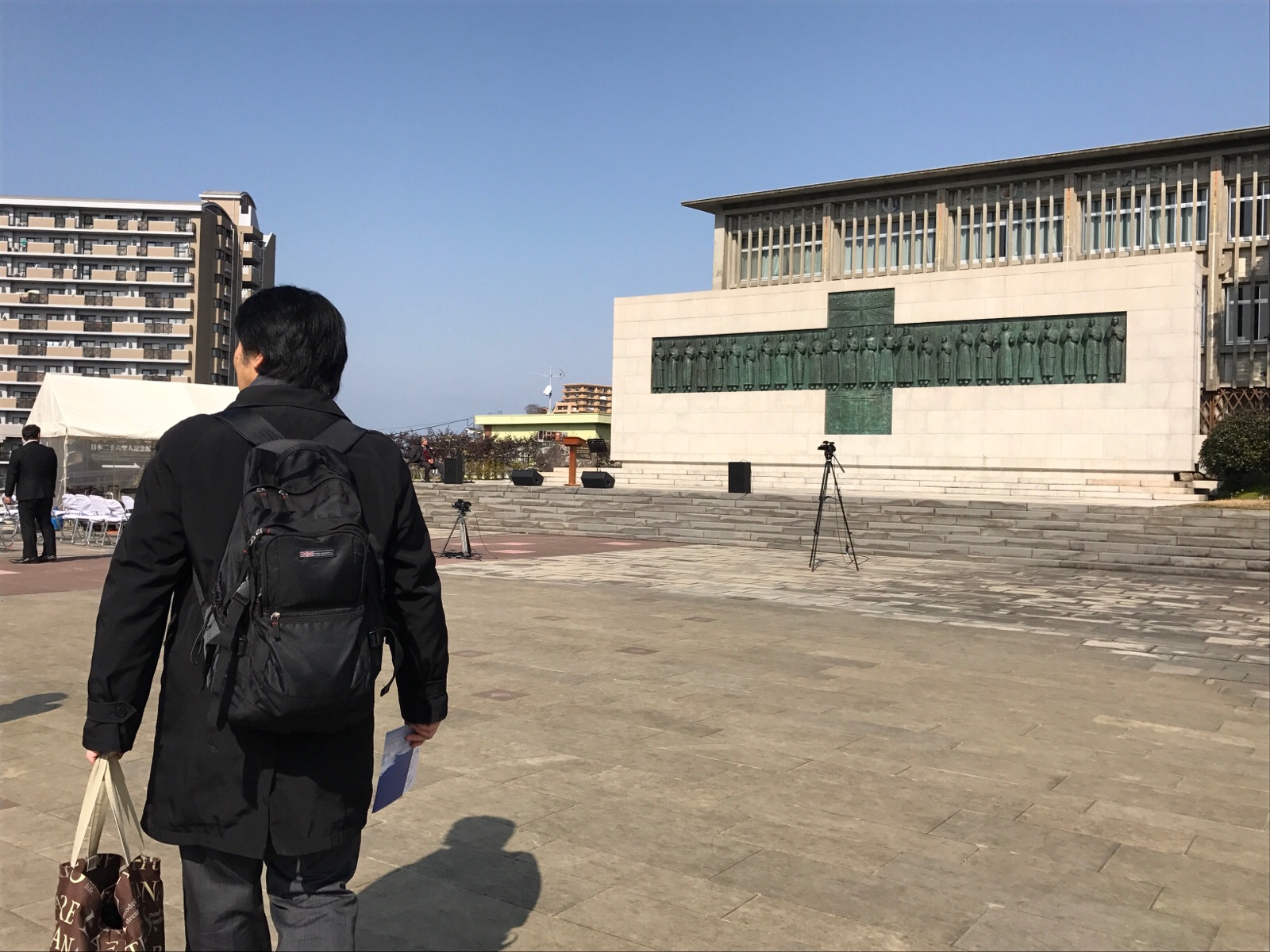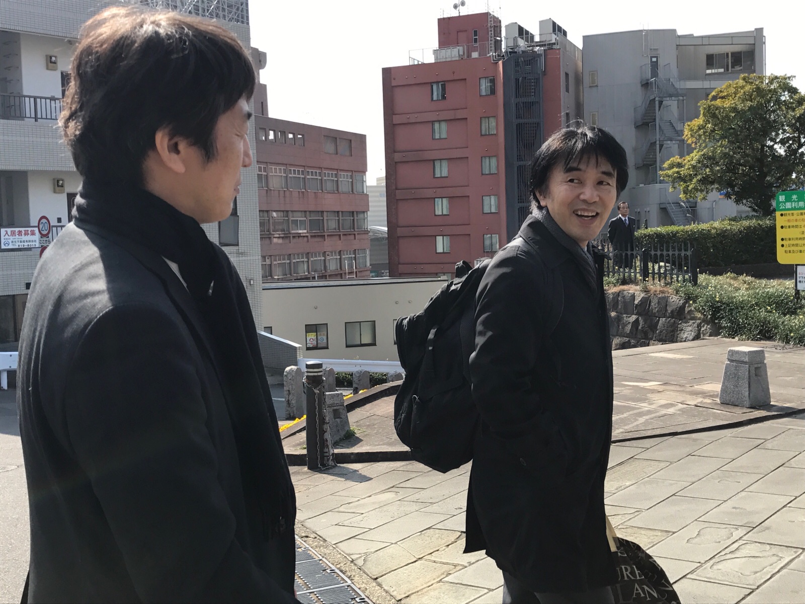 西坂の坂を登ると、三本松さん。映像設営部の車で長い道のりを無事に来られていました。 柏 ハンナ