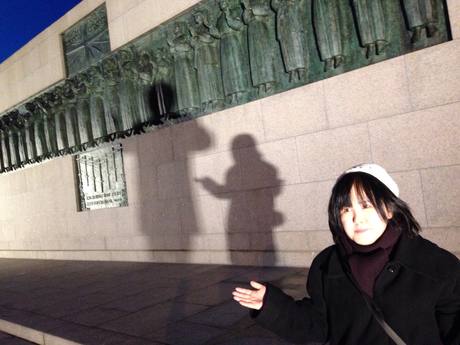 レリーフが、ライトアップされてます。私のかげも、写しましょう。 柏 テモテ