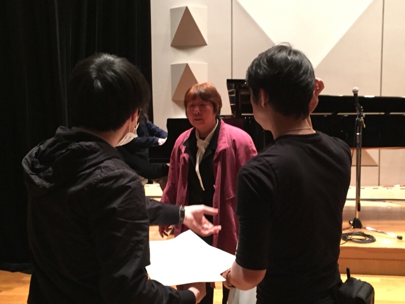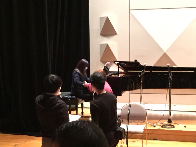 グランドピアノと各楽器メンバーの立ち位置を確認中です。テンポ、リズムなど合わせるには互いに見える位置が良いですが。エステル