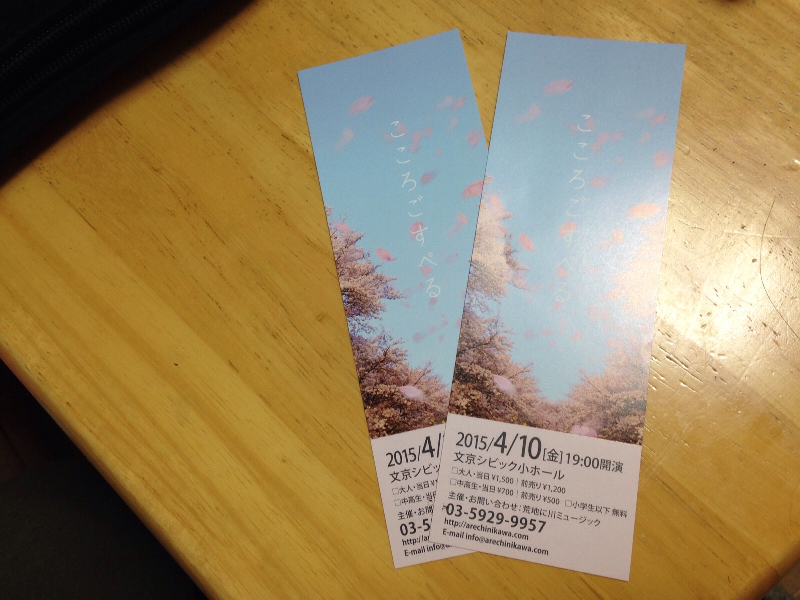 こころごすぺるのコンサートチケットを忘れずにもちました。会場いっぱいに、たくさんの人達が来られますように! ハンナ
