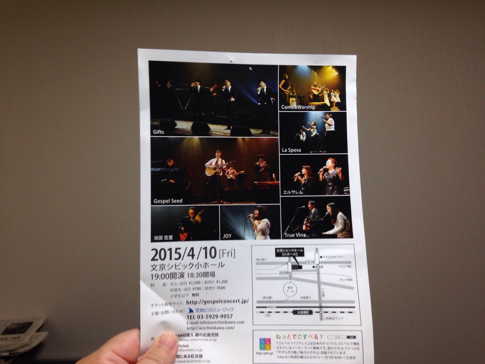 いよいよ今日は、こころごすぺるのコンサートですね!このチラシは、今日も持ち歩きです。また誰かに渡したいなあ… ハンナ