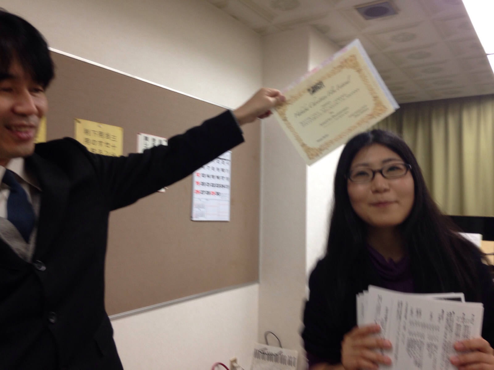 いたずらして頭の上には表彰状。卒業証書はもうすぐ来るよ。 ハンナ