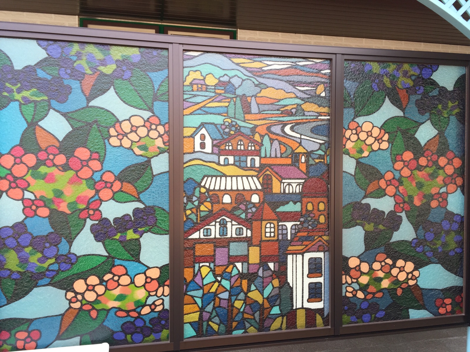 トイレ休憩で寄りました大村湾のパーキング。長崎らしいステンドのつい立が。