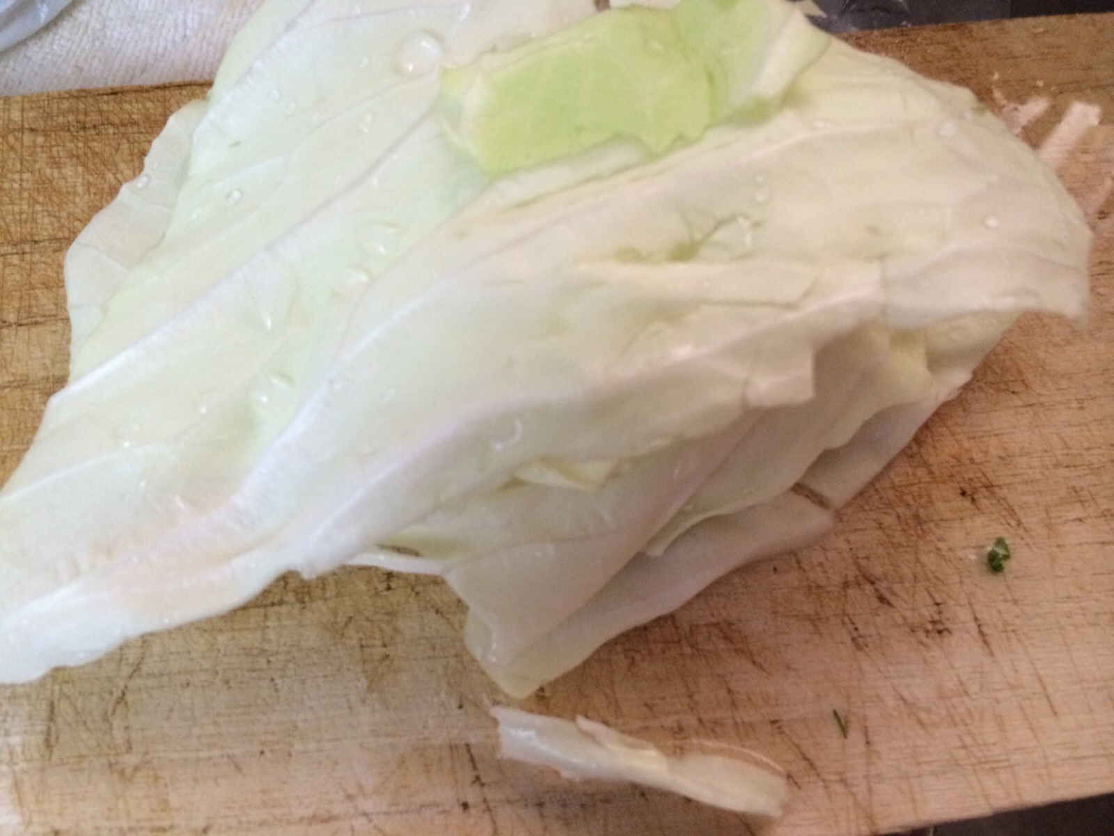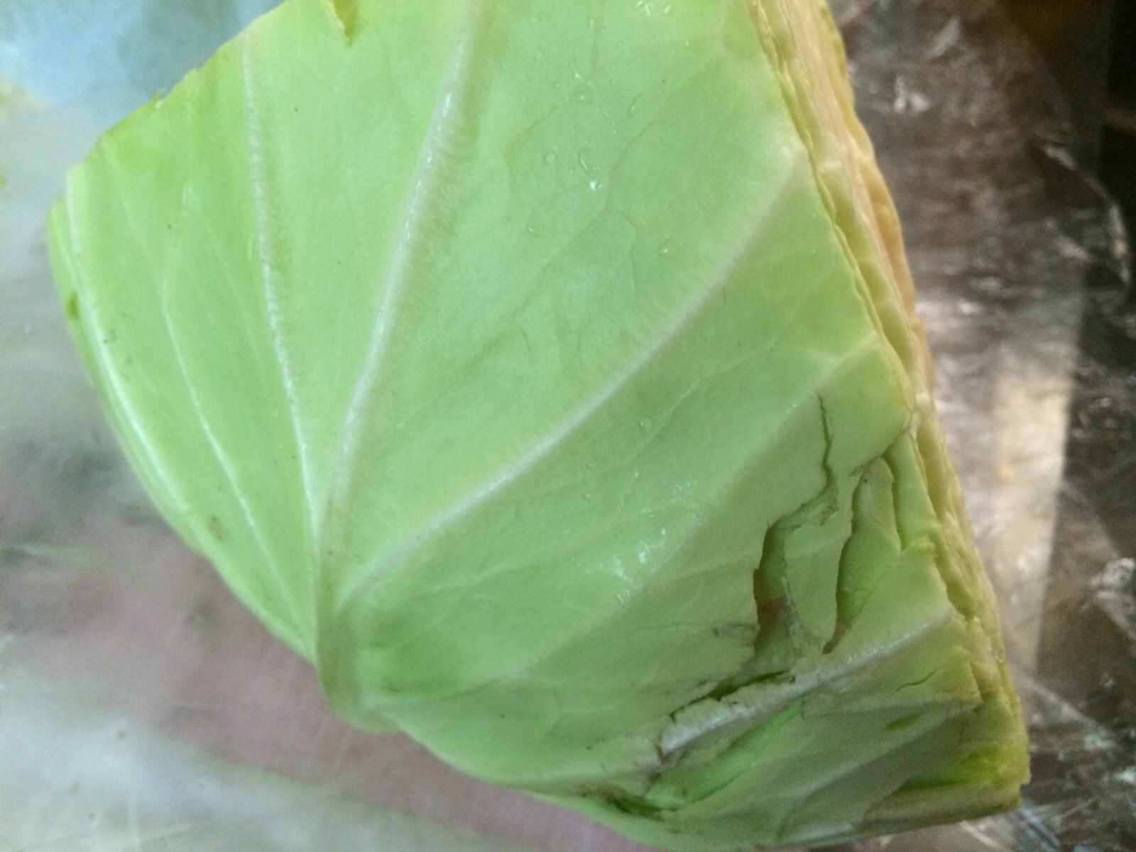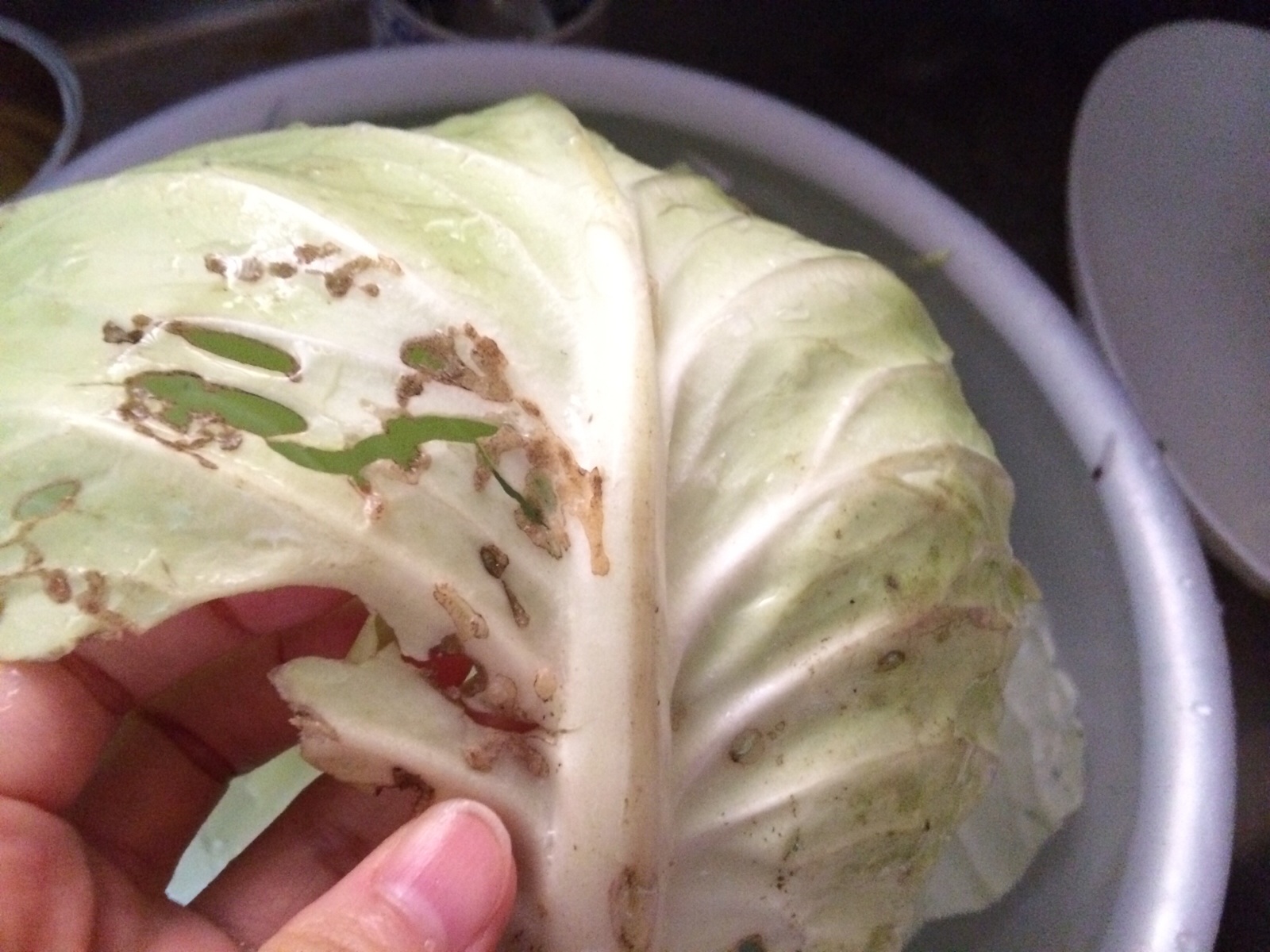 ご飯を作ります。まずは、小代さんにいただいたキャベツ。 早く食べるように、と、虫が食べてると、小代さんに言われました。 ミカエル
