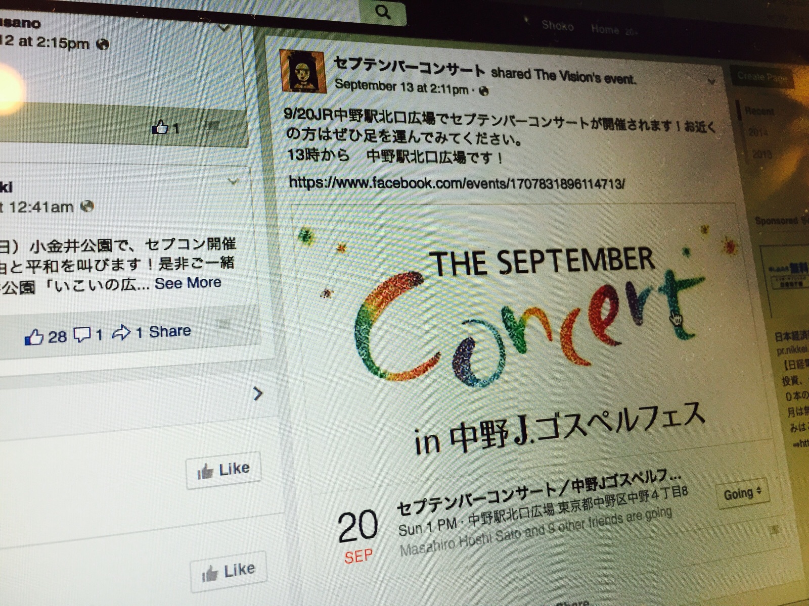 セプテンバーコンサートのFacebookにも、中野Jゴスペルフェスの情報を載せてもらえました(^-^) The Vision スタッフ
