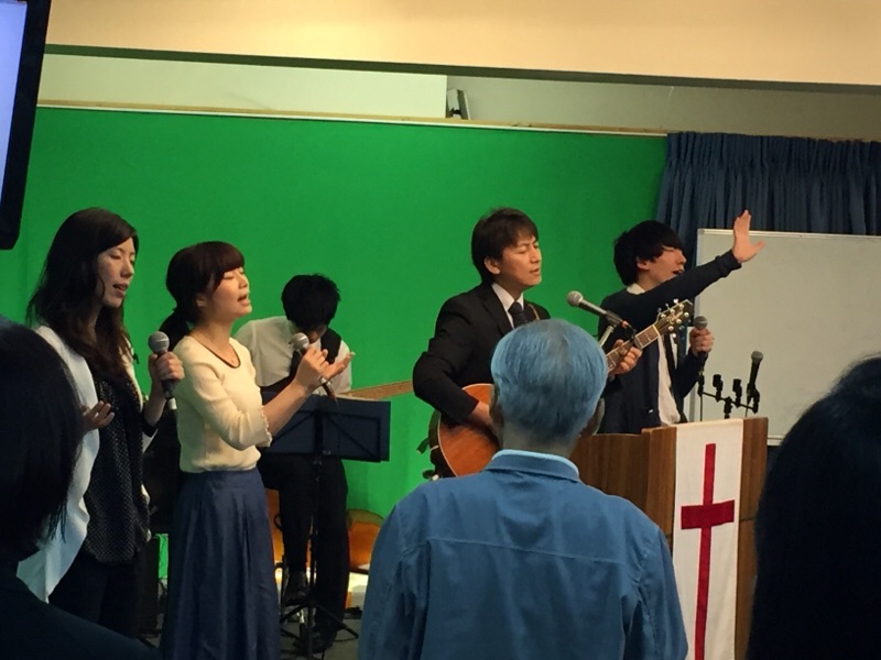 前半賛美リードは、ヨセフ三本松さん♫社会人会のタクヤさん、マミちゃんがコーラスで立っています。
