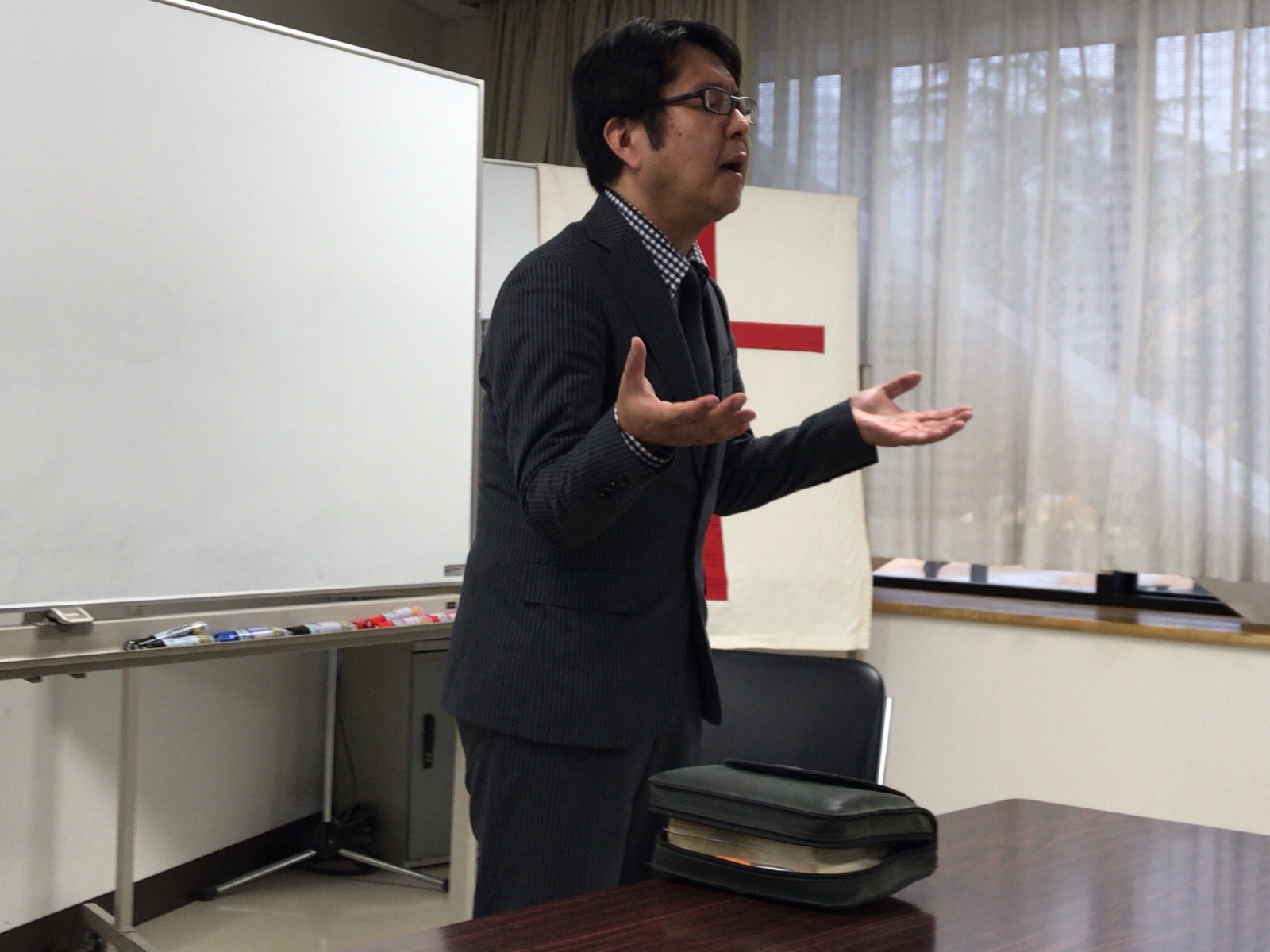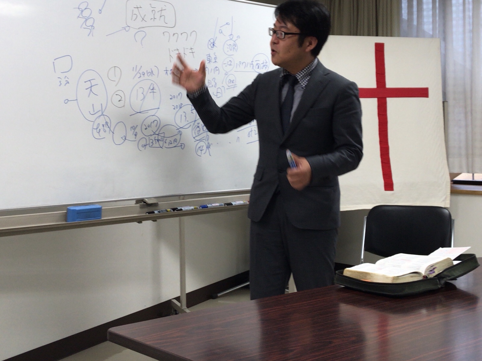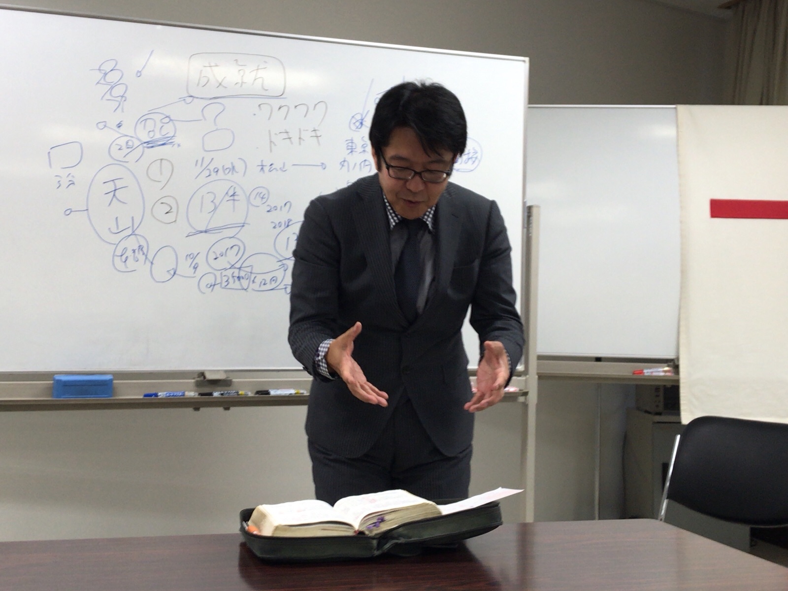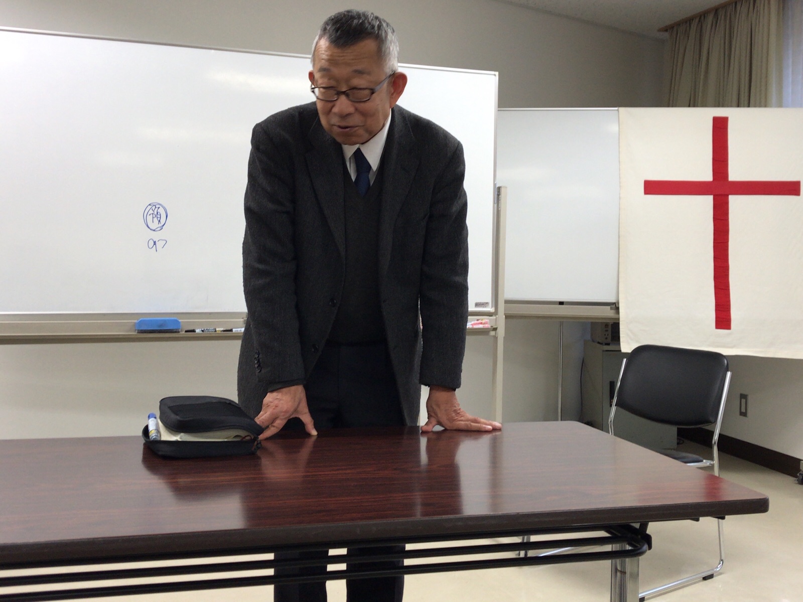 旧約聖書「イザヤ書14章24節」からメッセージを取り次ぐ掛本さん。 –sugisawa