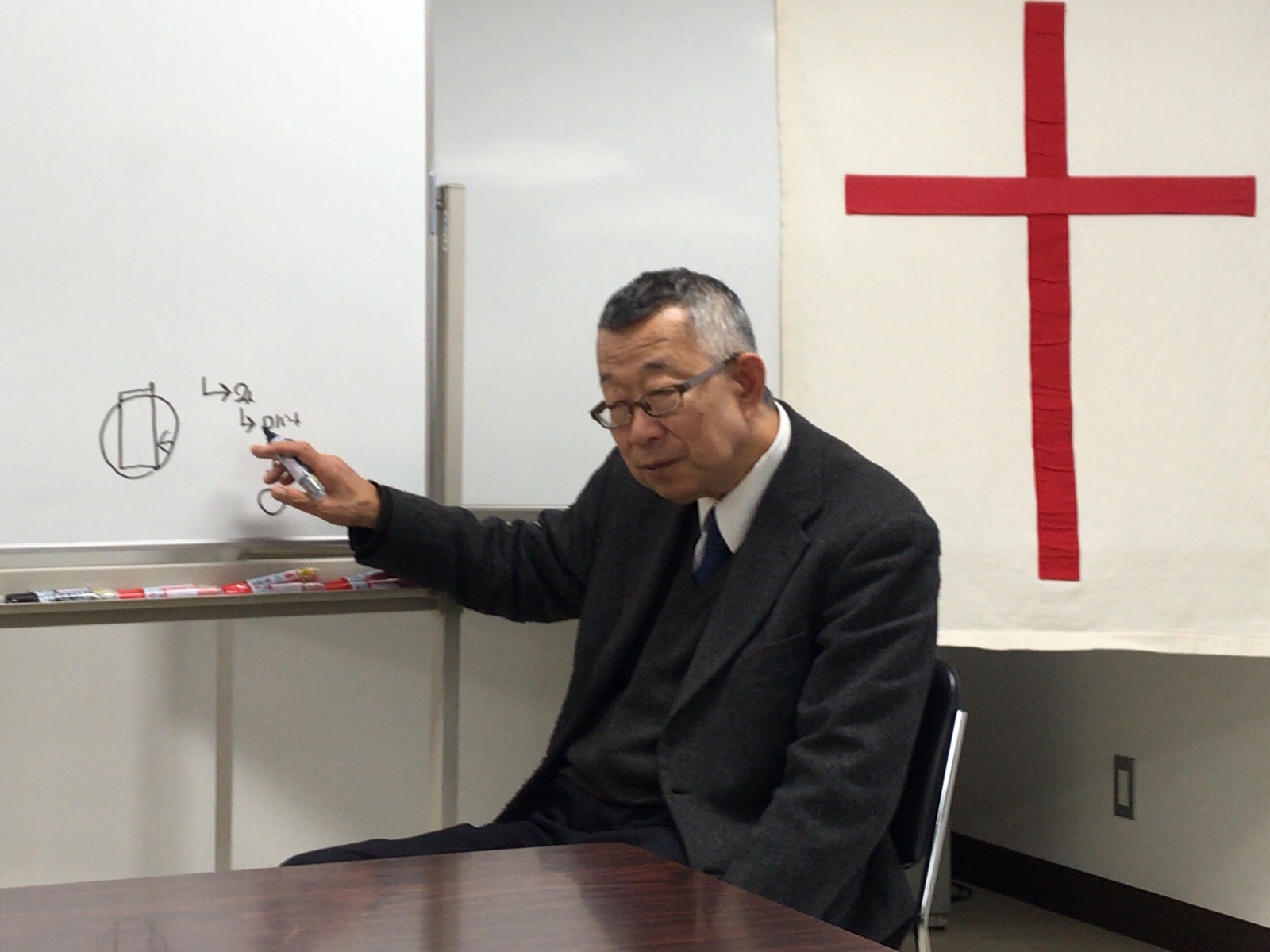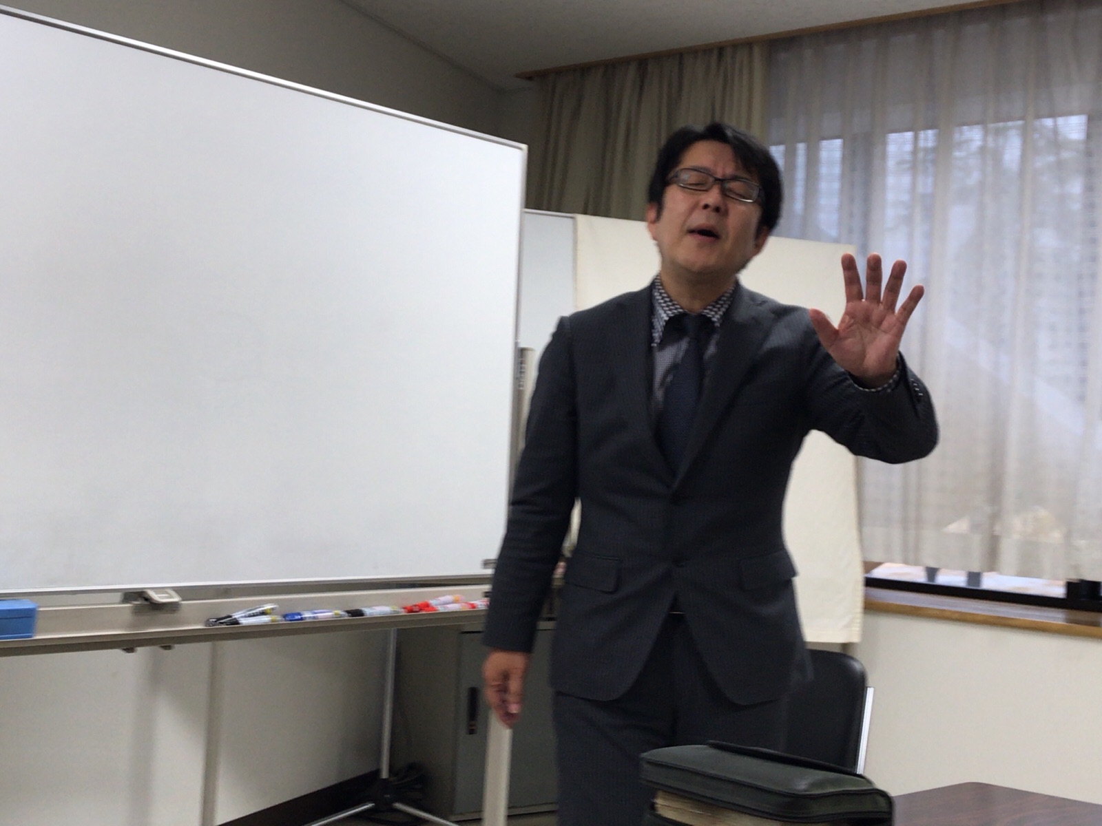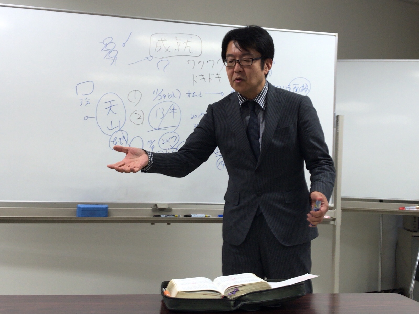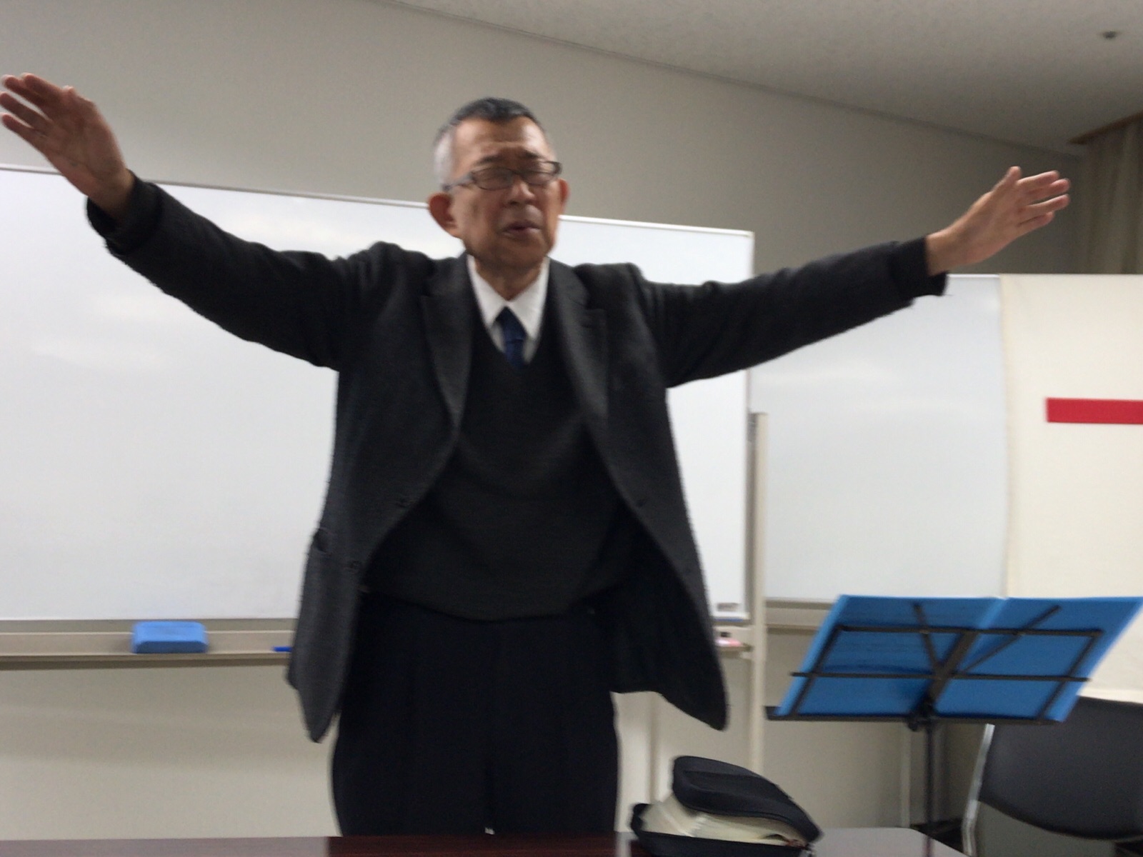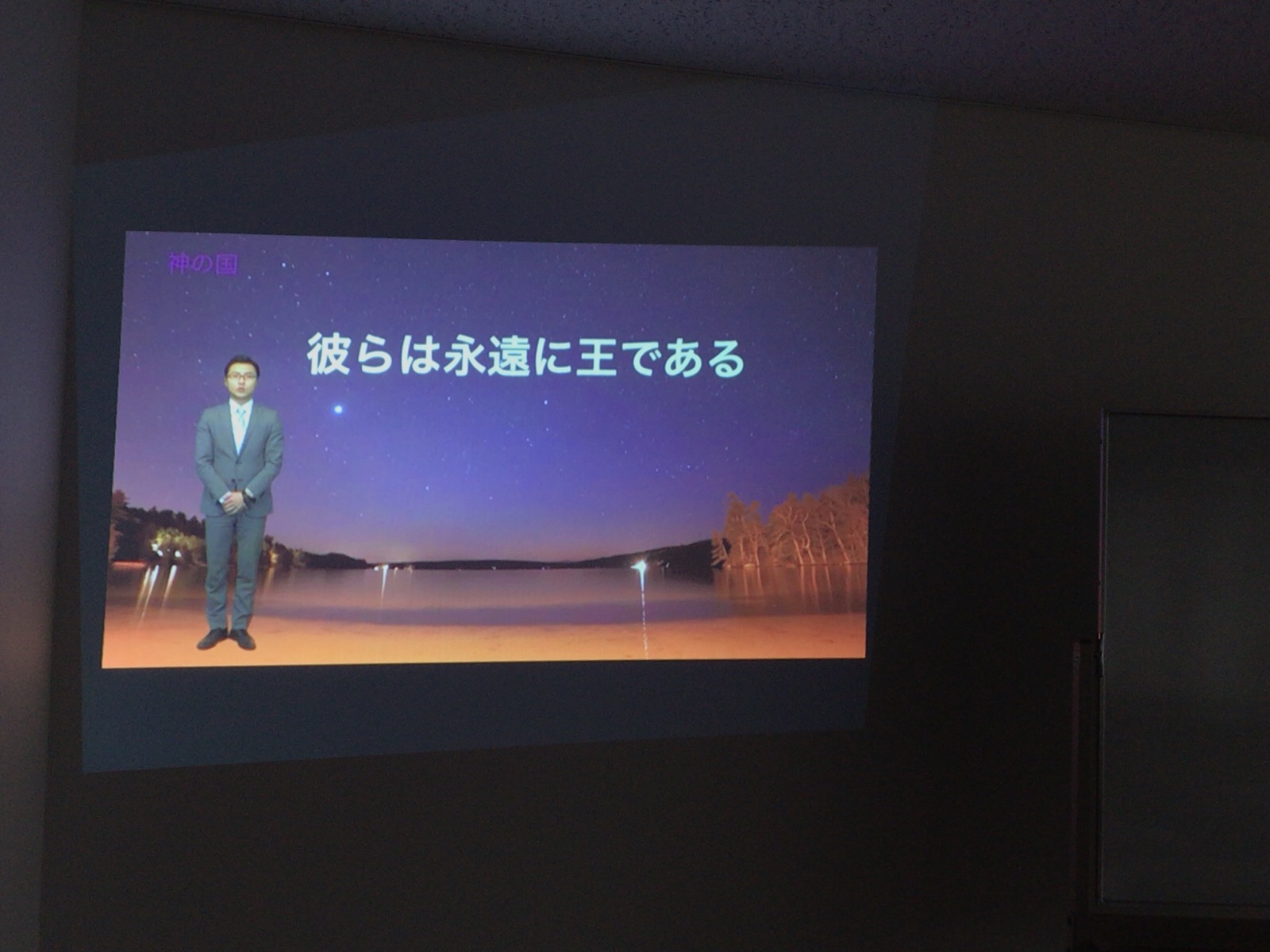 旧約聖書「イザヤ書14章24節」からメッセージを取り次ぐ掛本さん。 –sugisawa