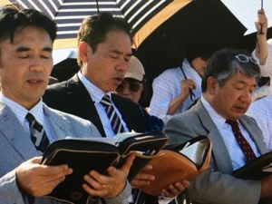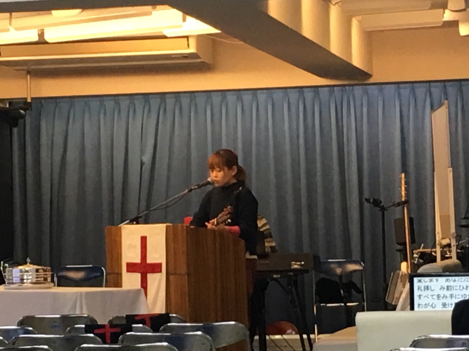 萱野さんが賛美を導いています。
