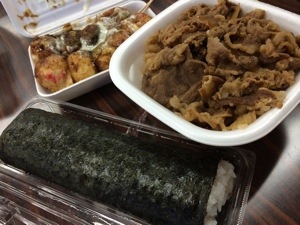 今日の夕ご飯です。 業務スーパーで買った巻き寿司とすき家の牛丼、そしてたこ焼きです。 チョット食べ好き?スプレンダーjohn