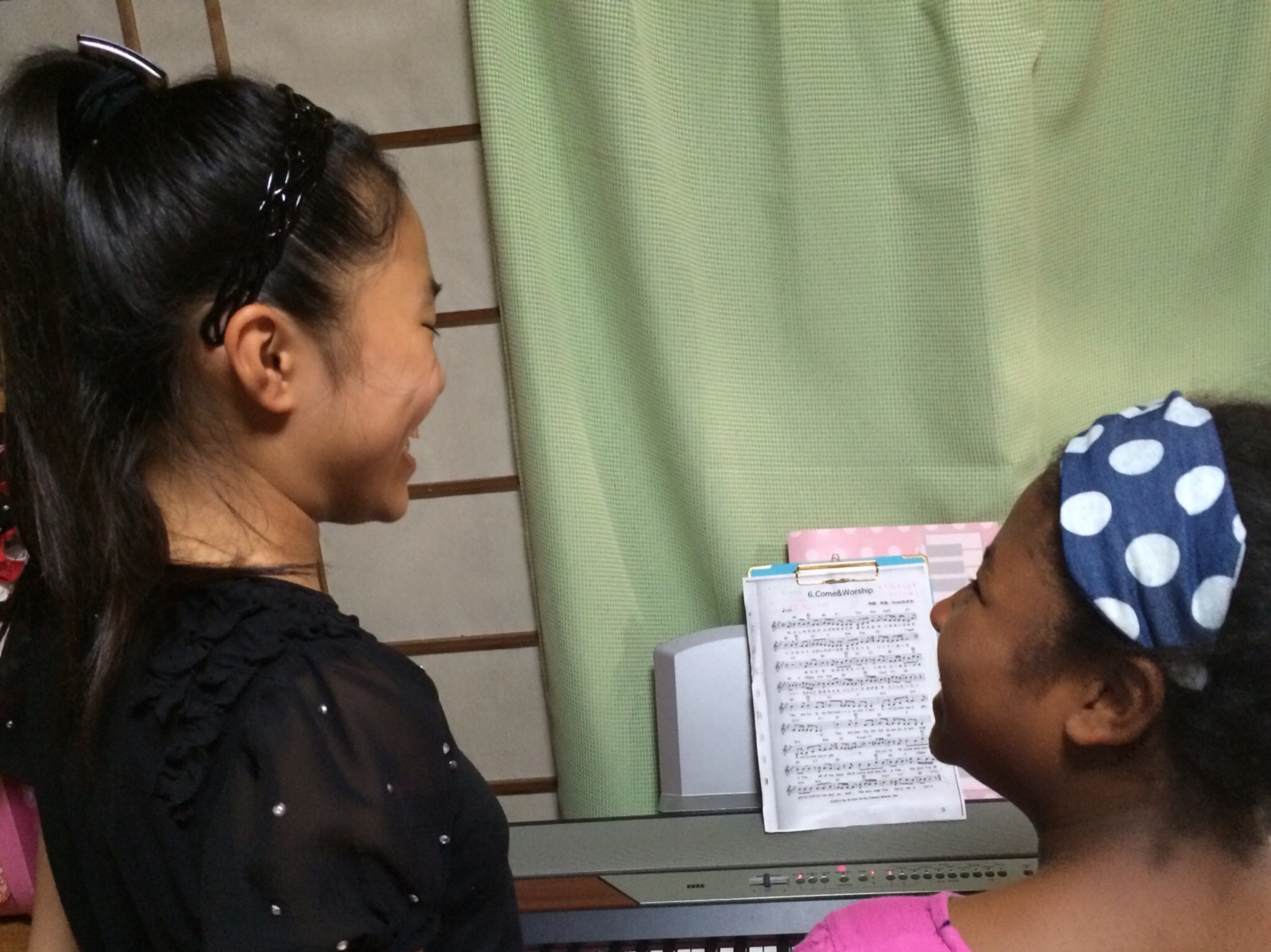 二人で楽しそうに、 賛美の練習をしています ほめ歌