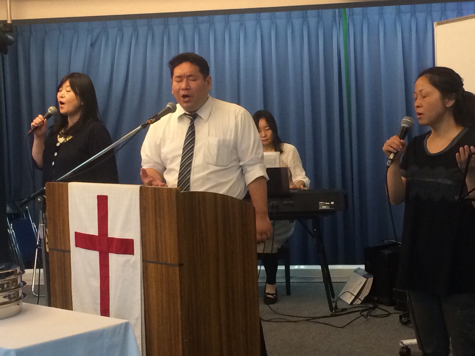 月曜第一礼拝がスタートしました! 賛美リーダーは真境名さんです。