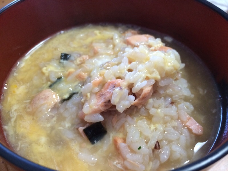 今日も、冷蔵庫の残り物で。 鮭があったので…。なかなかいける〜 胃にも優しいかも! amagai