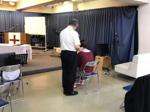 礼拝後の癒しの祈り。シオンさんの可愛いバックも追加でパチリ!