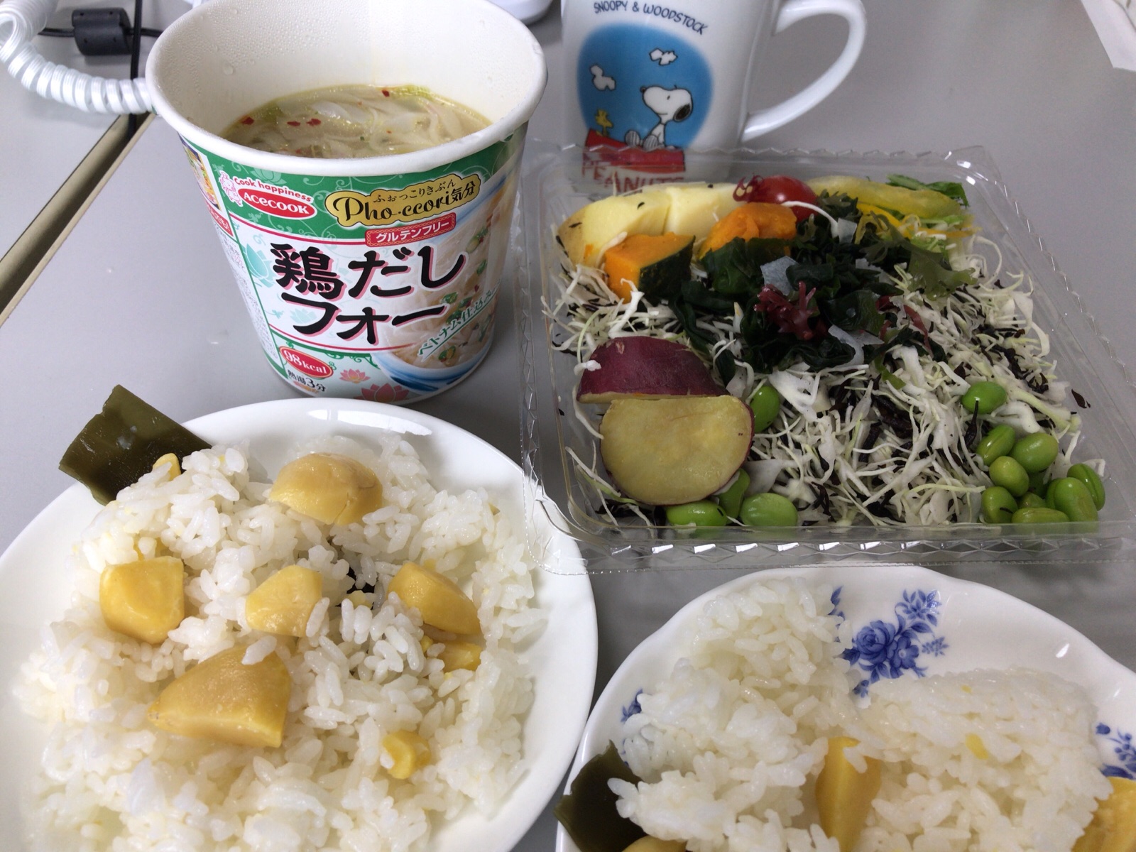 朝食の残りの栗ご飯に… 最近はまってる食物繊維&鉄分を補う?サラダを…! このサラダ姫ひじきが入っていて黒胡麻ドレッシングが付いていて… なかなか美味です〜♪ amagai