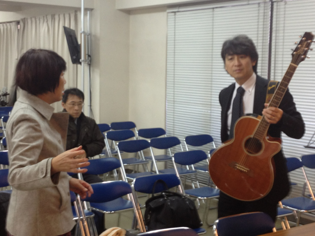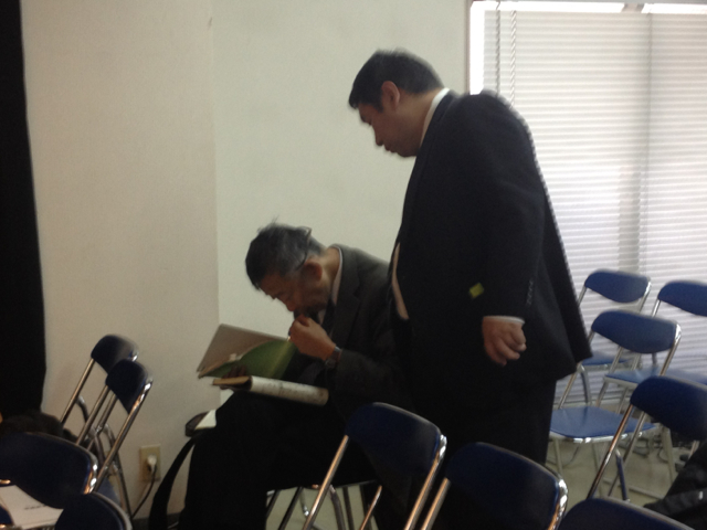 渡辺さんも来られました。 榊さんと三本松さん、設営について打ち合わせ。
