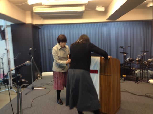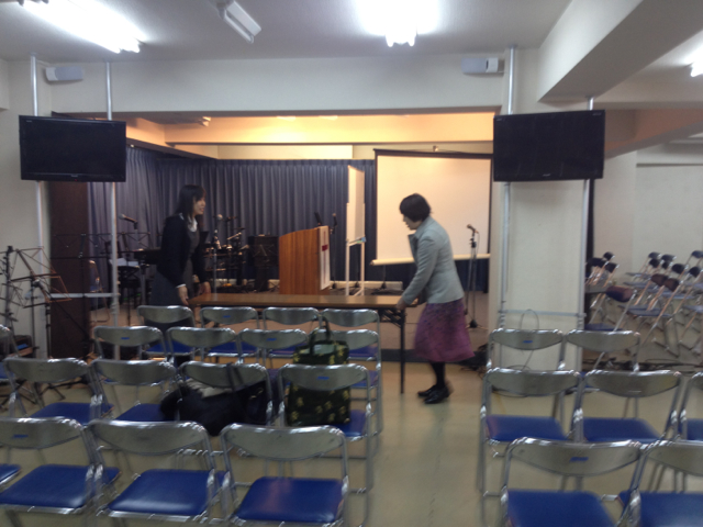 榊さん、会堂を見回って整えています。