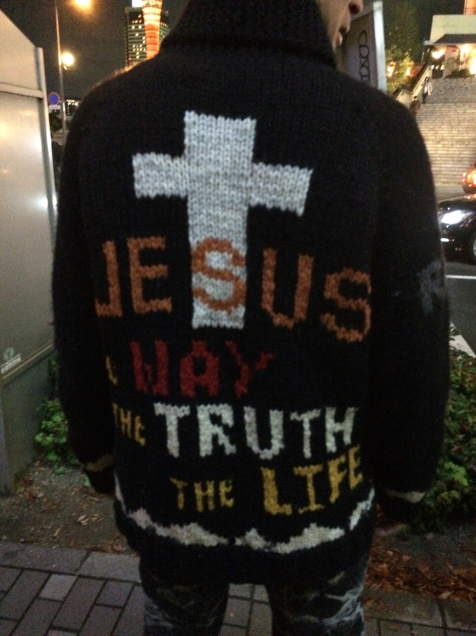 ハーバーランドランド歩いていたらJESUSのセーターを着ている人発見!本人に確認して写真撮りました。スプレンダーjohn