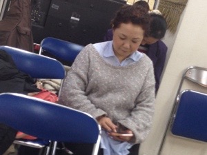iPhoneで何かを見ているエルサレムの真理子さん。さっきまで賛美でコーラスにたっていました。