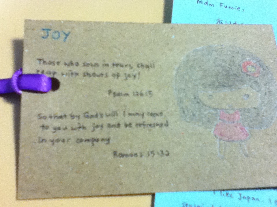 いえ、これはTeacher’s day(先生の日)のためのメッセージだと思われます。手紙を受け取るためのロッカーの中に入っていて、しばらくチェックしてなかったのですげ、おそらく先生の日のためにくれたのでしょう。名前が書いていなかったのですが、私がクリスチャンだと知って、クリスチャンの学生が私に素敵なしおりを作ってくれました。