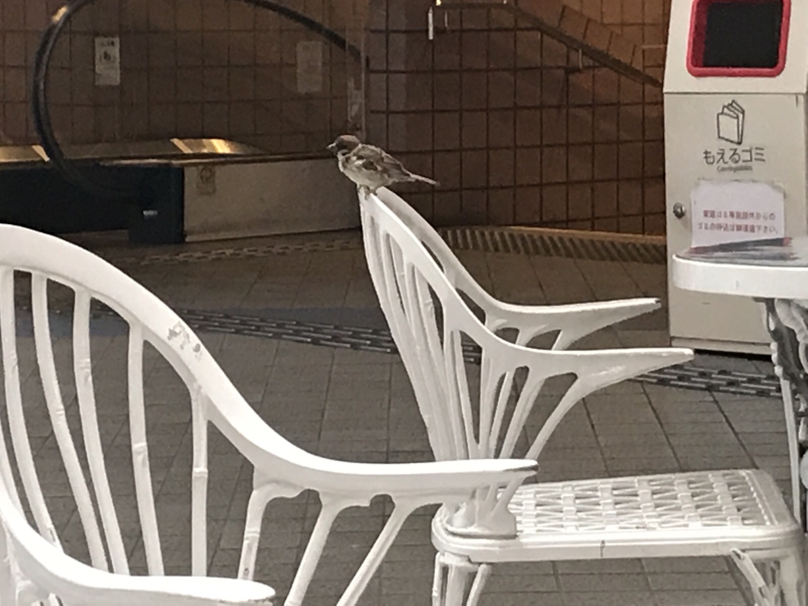 オープンスペースの休憩場所にスズメがやってきました。待機時間も楽しい♬ 仙台 シオン