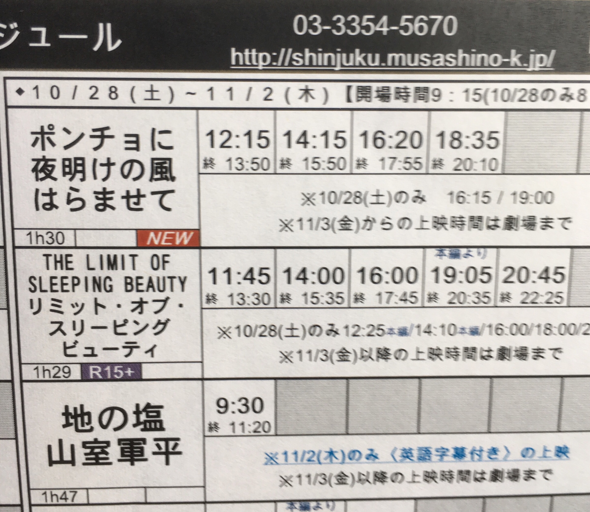 新宿武蔵野館の上映スケジュール、注意! 2017/10月/25 [水] 16:19