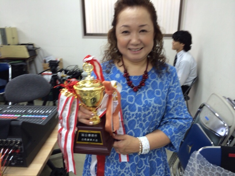 今回の賛美大会で優勝したエルサレム 優勝カップを手にはにかむ真理子さん。