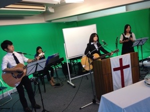礼拝スタート! 賛美リーダーは苫米地さんです。 コーラスにダビデくんもいます。