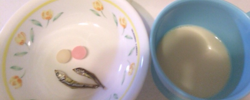 息子ヨッシーに毎日食べさせるおやつ。 豆乳、煮干し2匹、肝油2種。 ハルミ